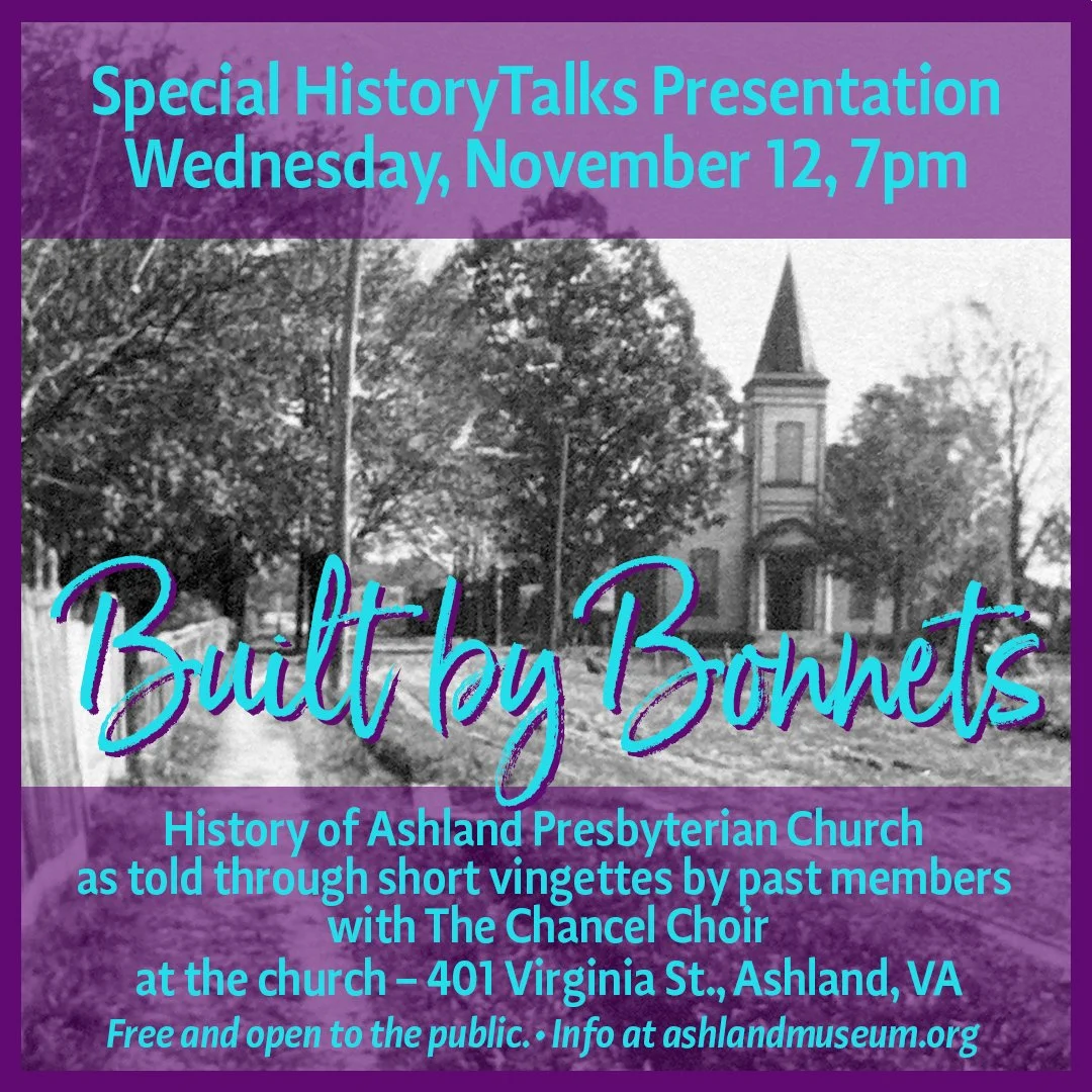 Wednesday, November 12, 7 pm, “Built by Bonnets” with Ashland Presbyterian Church